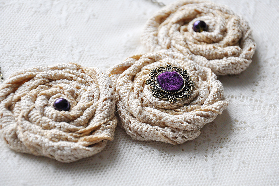 Un colier elegant, special chic & feminin compus din trei floricele din danteluta crem relaxata putin in ceai pentru a avea "patina timpului". Centrul florilor laterale este marcat de margelute violet din sticla, iar floricica centrala are in mijloc o piesa metalica antichizata, dantelata pe margini. Colierul se poarta la baza gatului iar diametrul fiecarei floricele este de aprox. 6/7 cm.